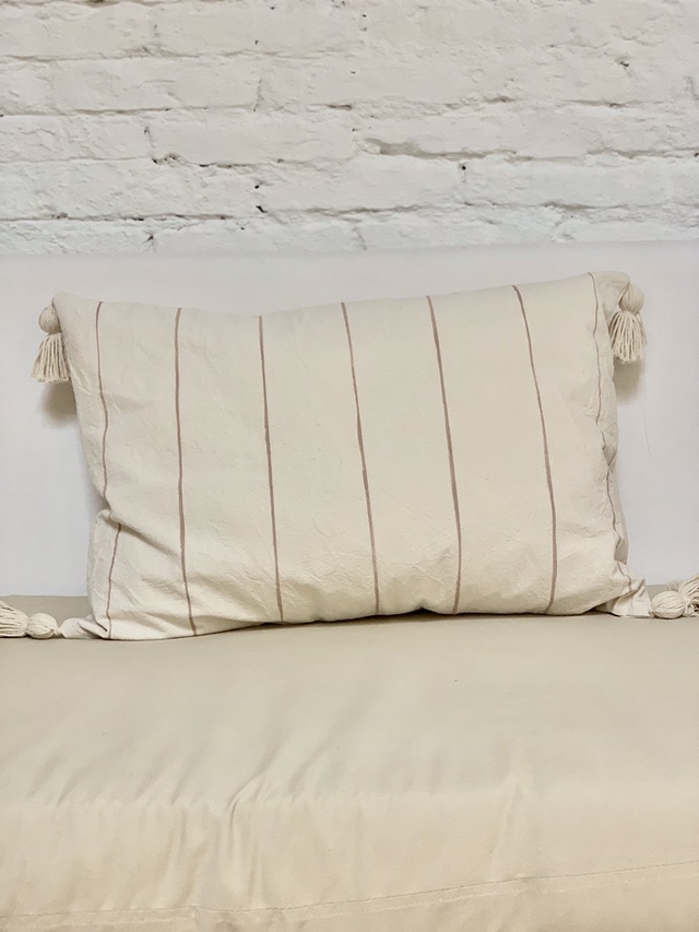 Almohadón en tussor natural pintado a mano con borlas hechas a mano con hilo de algodón natural / Con Microlineas en color rosa viejo